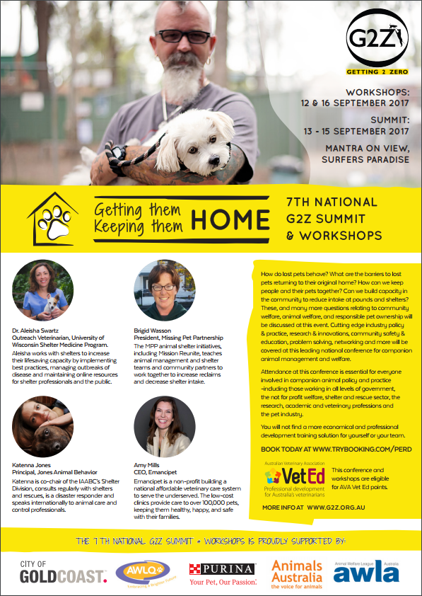 The theme for this year’s Summit is Getting Them Home, Keeping Them Home and concentrates on the largest population of incoming animals to any pound or shelter in Australia – those that are lost and stray.
