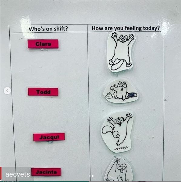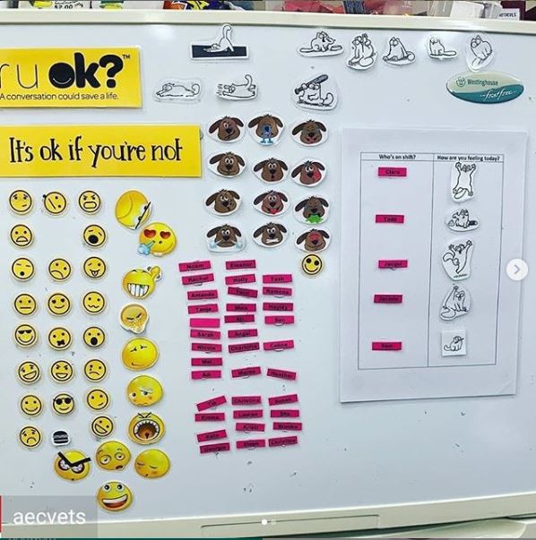 TW: The concept was introduced for an R U OK Day 3 years ago. Because our team work shifts and 24/7 we ran R U OK Week to ensure the benefits of R U OK Day reached the whole team. One of our veterinarians Dr Maree Maher was the brainchild behind the idea, Maree thought the Mood Board would be useful for those who may be feeling down or just having a difficult shift to be able to express this to the team without having to talk about it, or even just to express how they are feeling throughout their shift.