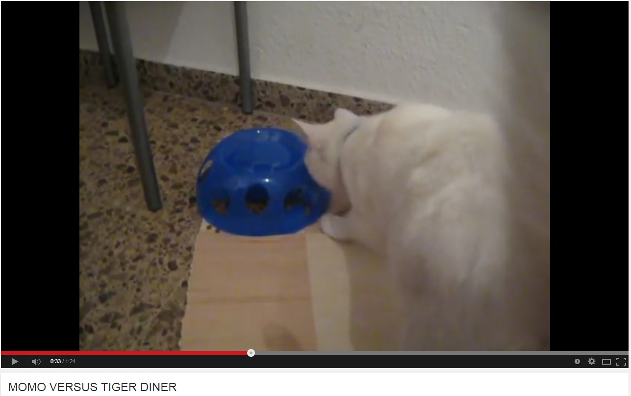 All three cat slow feeders are suitable for dry food and encourage the cat to investigate and use its paws. For cats who already like to pick up their food with their paws, you may be able to use moist/wet food in the Stimulo and it can also work quite well for some cats as multi-cat feeder. The health benefits include reduced regurgitation/vomiting and obesity. Click on the image above to watch a video of Momo using the Tiger Diner: